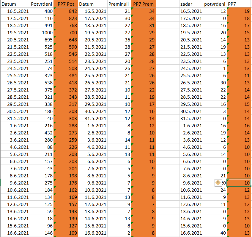 I iz moje perspektive je tu hrpa nelogičnosti i bit će ih i dalje, no eto sto ljudi sto mišljenja, evo Never npr. je sklon takvim mjerama pa sad ti to usuglasi sve, pritisak na turizam, razne crvene zelene i ljubičaste liste europskih zemalja itd. Ne mogu si ipak pomoći pa ću staviti tablicu zaraza, ovaj skroz desni narančasti stupac je 7-dnevni prosjek u ZD županiji, i sad kad pogledaš rast između 25.5. i 1.6., te od tekme 5.6. pa do danas, isti k, znači nešto što se ne može pripisati utakmici nego slučajne fluktuacije normalne s obzirom na tako niske brojke (čista statistika).