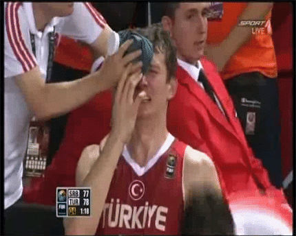 Teodosic ga udario u donji deo lica a ovi mu stavili oblogu na oko! Ali dobro, nije mogao da isfolira da mu je donji deo brade povredjen, za oko je lakse. Naravno minut kasnije je skakao na centru zajedno sa ostalima savrseno zdrav.