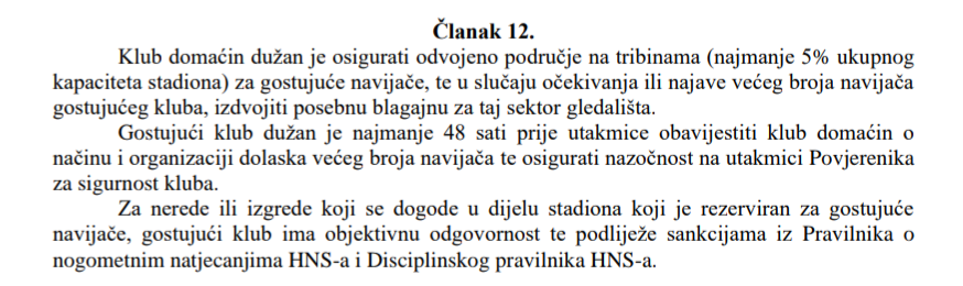 Na stranici 32. Pravilnika, u odredbi članka 28., navedeno je sljedeće: "U slučaju da odvojeno područje stadiona za gostujuće navijače čini više od 5 posto ukupnog kapaciteta stadiona, sva mjesta u odvojenom području moraju biti stavljena na raspolaganje gostujućem klubu."