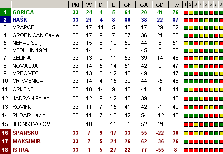 | 1 | Gorica | 33 | 24 | 4 | 5 | 61 | 20 | +41 | 76 | |