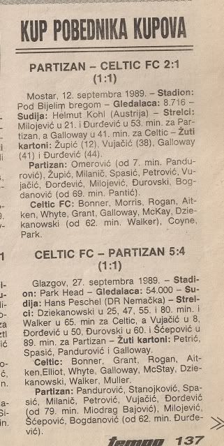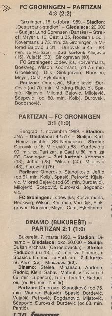 pohod Partizana do cetvrtfinala... morali su biti domacini u Mostaru i Podgorici jer je Stadion JNA bio kaznjen zbog nereda Partizanovih navijaca, baklji, petardi i slicno... mitska utakmica u Glasgowu, pa mitske dvije utakmice s Groningenom i onda su ispali od bezveznog Dinama (B)... s obzirom na inace ispodprosjecnu domacu sezonu, cetvrtfinale je bio veliki uspjeh...