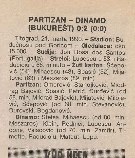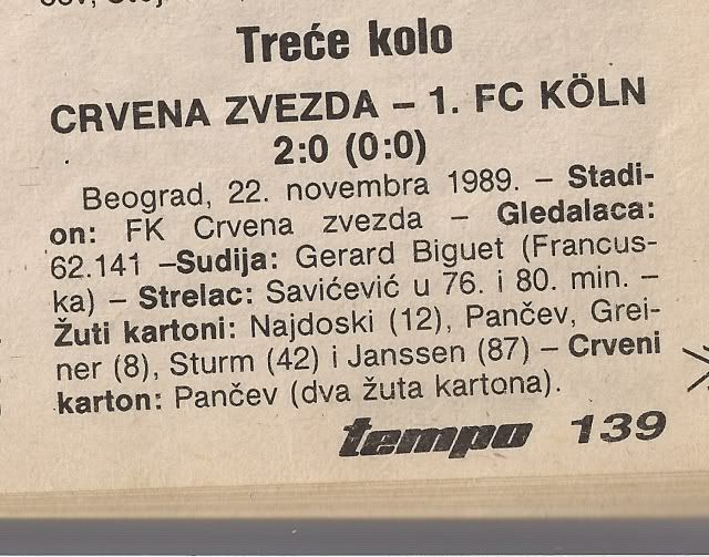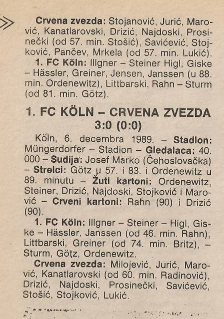 doma Zvezda dobila tesko 2:0 i puna optimizma otisla na revans... tamo se drzala dobro do deset minuta prije kraja, kad je torpedirana s dva gola za ukupnih 0:3... onda je uslijedilo naganjanje suca po terenu, pljuvacina opca, tucnjava, Prosinecki je naganjao pomocnog suca... bila je to posljednja europska utakmica Dragoslava Sekularca na klupi, jer je kaznjen s nekih 5-6 utakmica zabrane vodjenja momcadi... mucno ispadanje, no Zvezda je iz svega ocito nesto naucila... Koln je ispao u polufinalu od Juventusa tijesno 0:0, 2:3