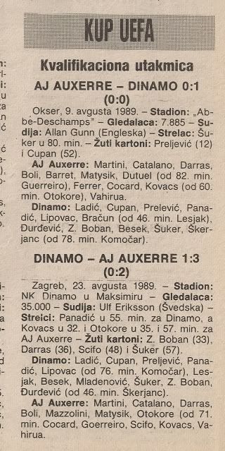 zanimljiva je prica kako je uopce doslo do utakmice Auxerre - Dinamo: u ta stara vremena, UEFA je imala 32 clanice i Kup prvaka i Kup kupova su organizirani po jednostavnom sistemu: imas 32 momcadi, jednostavan sustav tekmi po kolima doma-vani i to je to... slicno je bilo i s Kupom UEFA, u koji je u pravilu ulazilo 64 momcadi... no, te sezone su Jugoslavija i Francuska imale isti koeficijent, svaka je tako dobila pravo na 3 ekipe u Kupu UEFA... danas bi Uefa u pretkolo uputila predstavnika San Marina i Andore i problem rijesen. Francuski "L'Equipe" je predlozio, a UEFA prihvatila, da se odigra kvalifikacijska utakmica (danas bismo rekli pretkolo) izmedju predstavnika YU i FRA... i tako je Dinamo putovao u Auxerre... nakon sretne pobjede u prvoj utakmici, doma se ocekivala egzekucija, stadion pun, ja na Sjeveru i onda su poceli sokovi i pocetak krajnje baksuzne serije Dinama s velikim klubom iz malog francuskog grada...