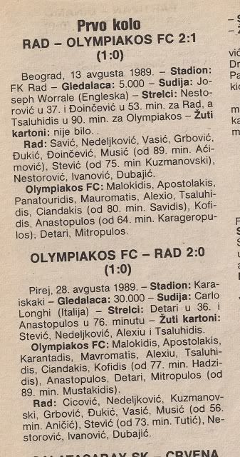 mali klub iz velikog grada, tj. FK Rad je zapravo bio avangarda... mali bezvezni klub bez navijaca (pokazat cu kasnije njegove domace ligaske posjete, katastrofa) se dokopao velike Europe... pravi predvodnik cijelog vala slicnih klubova tramvajskih liga nastalih nakon raspada zajednicke drzave... izvukli su slavni Olympiakos i doveli se na rub senzacije i prolaska, da nisu primili glup gol u zadnjoj minuti (bilo je to vrijeme kad nije bilo sudacke nadoknade i kad je produzetak bio maximalno 2 minute, osim ako se igra u Ljubljani