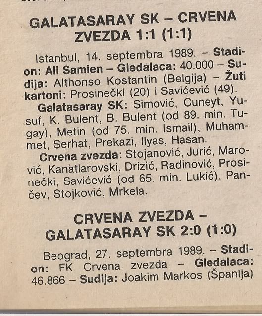 Galatasaray je sezonu prije, predvodjen bivsim zvijezdama yu-lige, golmanom Simovicem i Dzevadom Prekazijem, dosao do polufinala Kupa prvaka i Zvezdi nije bilo svejedno kad su ih izvukli... danima prije utakmice se pricalo o fanaticnim Turcima koji napune stadion u 11 ujutro za utakmicu koja pocinje u 8 navecer, pa onda ne odlaze sa stadiona jos dan-dva... Zvezda ih je rijesila rutinski... od silne nervoze i uzbudjenja, izazvanog tradicionalnim navijackim crveno-belim transom, urednistvo Tempa je zaboravilo napisat strijelce u prvoj utakmici... u drugom kolu je izbacen neatraktivni, a potencijalno opasni suparnik iz CCCP-a i...