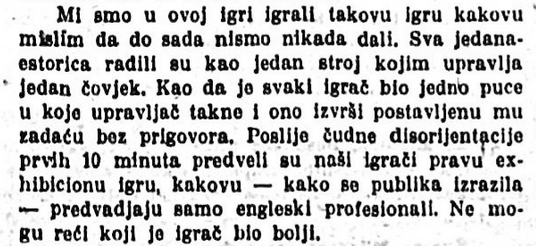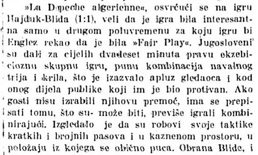 Ja sam uoči odlaska na turneju bio uvjeren u vrijednost moje momčadi. Na turneji me ona nije demantirala. Dapače, igrala je tako dobro da je tuniska, alžirska i marseljska štampa, najljepšim riječima opisivala momčad, njezinu igru, kao i igru pojedinaca. Alžirska štampa je posebno isticala, da je naša tehnička igra na najvišoj razini i da je bolja od najbolje tehničke igre koju su prilikom gostovanja u Alžiru demonstrirale izvrsne francuske i druge momčadi.