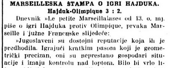 Na povratku je bilo planirano nekoliko utakmica s jakim francuskim ekipama (Montpellier, Cannes, Cette) i gostovanje kod Intera u Milanu no nažalost odigrana je samo jedna i to u Marseilleu. Francuski osvajač Kupa (Francuzi između 1919. i profesionalizacije svoje lige 1932. igraju samo regionalna prvenstva) Olympique Marseille tada prevođen svojim sjajnim spojkama, reprezentativcima Jeanom Boyerom i Edouardom Croutom, poražen je 2:3 i to po izjednačenju domaćih nakon 0:2 na poluvremenu usljed pada u igri zbog ozljeda brojnih igrača Bijelih. Ipak Hajduci su smogli snage za dodatni pritisak i gol za pobjedonosnih 2:3. Sjajan dojam ostavili su Tonči Bonačić koji će kasnije i zaigrati za Marseille i Ljubo Benčič koji je, iako načet ozljedama obje noge, spektakularno zabio ušetavši se u gol nakon što je predriblao pola domaće ekipe. Međutim, ovo je bio kraj, nakon što su otpali prvo Dujmović i Mihaljević, potom Šuste, na ovoj utakmici ozljedila su se još četiri naša igrača, pa je Hajduk bio prisiljen otkazati preostale planirane utakmice i – natrag za Split.