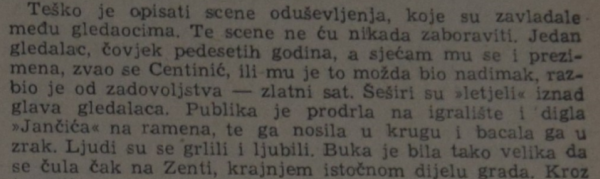 - Ali prid revanš sa “Građanskin”, dok san poliva plac vodon, doša je on, Janjčić. Već je bi bolestan, mršav. Pita san ga ča je doša. Reka je: “Zar mi neš dat, da igran sutra makar deset minuti?” Vidija san da je slab i zna da boluje od sušice. Bilo mi ga je puno ža. Reka san mu da je bez kondicije. A on će: “Moraš me pustit barem deset minuti, duša me boli… Moran dokazat da nisan bija kriv…”