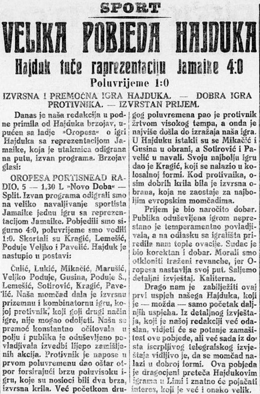 Na današnji dan prije 95 godina Hajduk je u Kingstonu igrao protiv reprezentacije Jamajke: