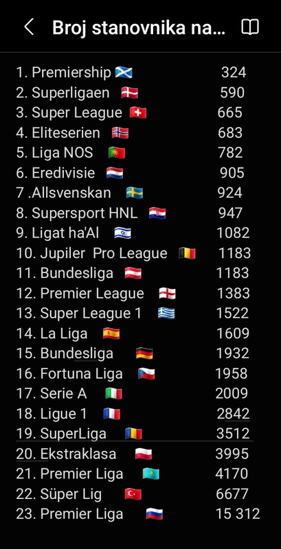 Lista 25 najposjećenijih europskih liga s obzirom na broj stanovnika (br. stan/prosječna posjeta, što manje to bolje)