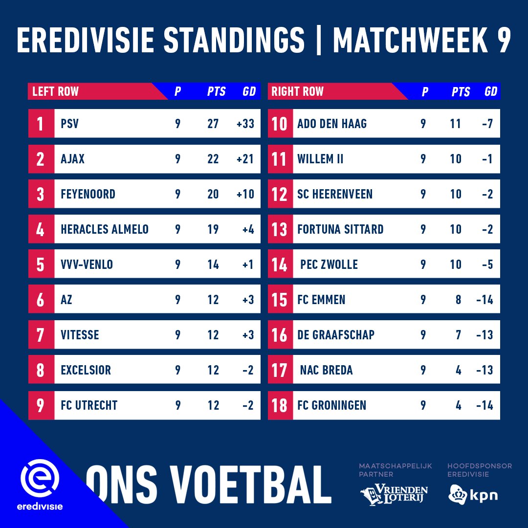 Sljedeće kolo u petak otvaraju Emmen i VVV. U subotu igraju ADO-NAC, de Graafschap – Excelsior, Groningen – PSV i PEC – Heracles. De Klassieker je na rasporedu u nedjelju u 14:30. Taj dan se još sastaju Vitesse – Fortuna, Willem II – Utrecht i AZ – Heerenveen.