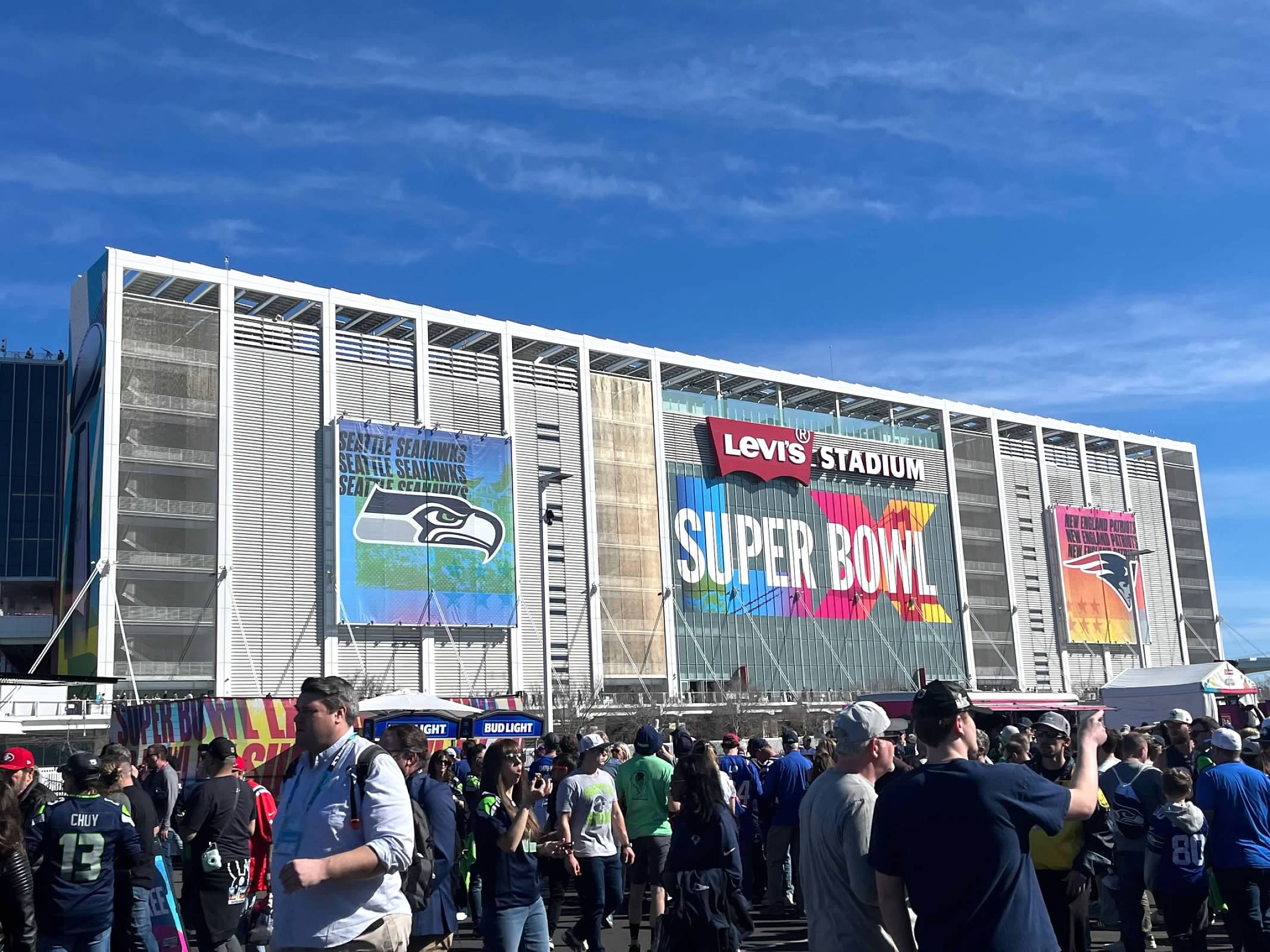 Super Bowl crowd je dosta drukcije. I reko bi da je jedno 1/3 neutralnih ili ljudi koji ne navijaju ni za Hawks ni za Patriots. Dosta ljudi koji su imali neke hoodies ili majice sa Super Bowl, bez obiljiezja timova koji igraju, znas da su tu samo zbog Super Bowl. Reko bi od ostatka jedno 65% to 70% su bili Hawks fans. Osjecalo se ko domaca utakmica. Dobro, Seattle je dosta blize od New England. Ali isto i ko protiv Denver, ja mislim da je dosta navijaca Hawks tu bilo sto idu na utakmice pa su znali kad praviti buku dok su Patriots nekako vise bilo obitelji, tu za Super Bowl. Vrijeme je bilo prekrasno oko 20'C. Ali kasnije kad je sunce zaslo, vjetar je bas duvao.