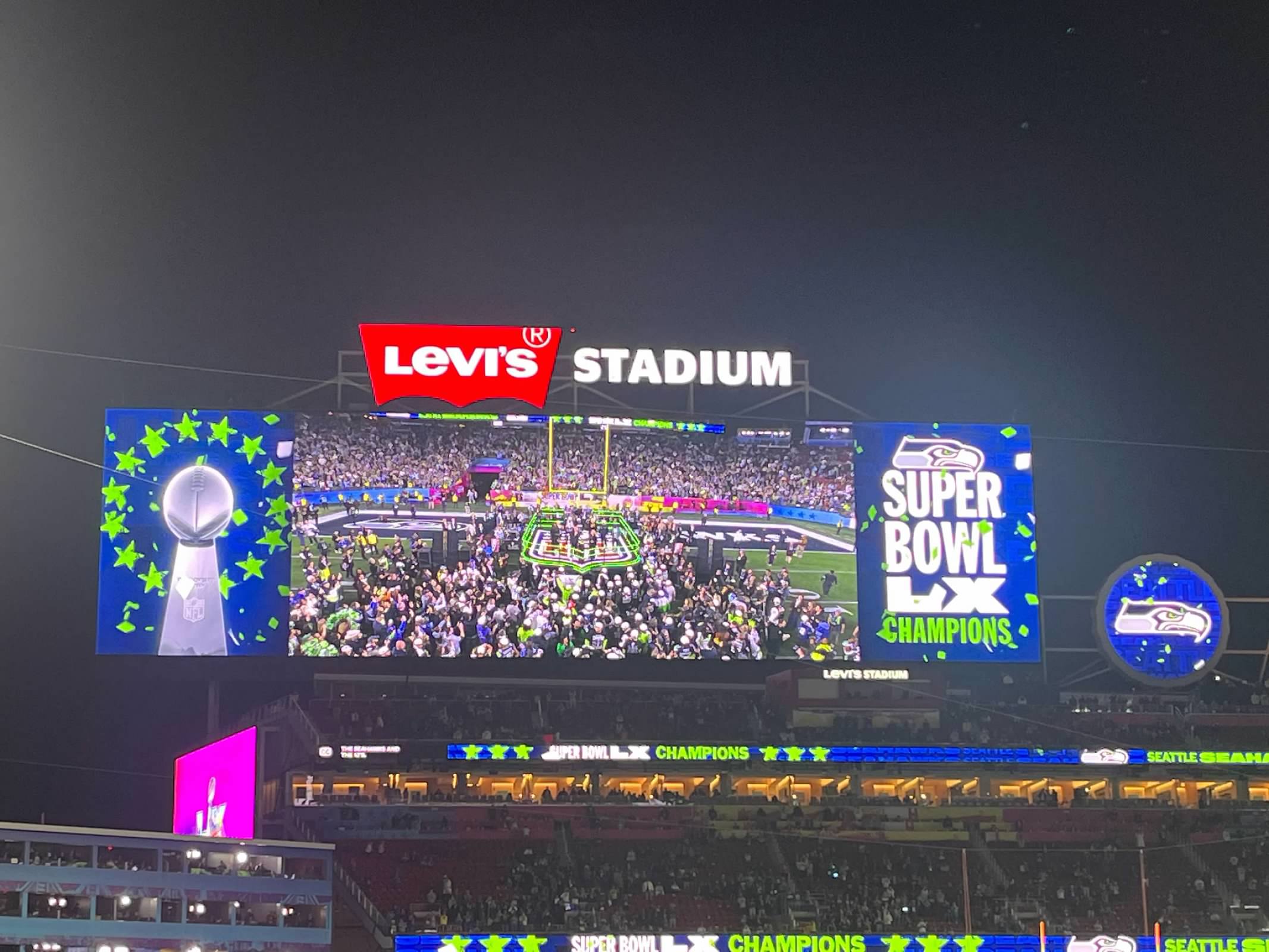 Usli smo u stadion oko 12. Utakmica je pocinjala oko 3:30. Bilo nas je sve zajedno 10. Ali nismo zajedno sjedili ali bili smo dosta blizu. Rijetko tako udjem u stadion ranije ali bilo je nekih actvities unutra ali svugdje je uglavnom red ogroman bio. Recimo bilo koja prodavnica da je prodavala stvari sa znakom Super Bowl imal je jedno 200 ljudi da cekaju da udju. Ja sam praznovjeran pa ne bi svakako ni kupio nista dok ne osvoje 😀. Mi smo uglavnom po pivama udarili jer se nije puno cekalo.