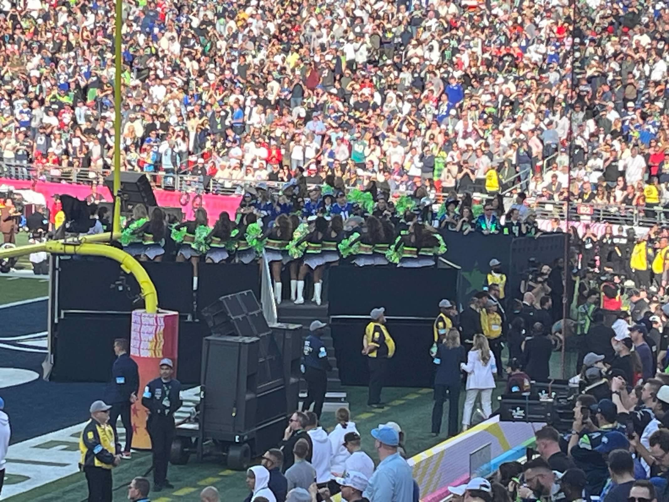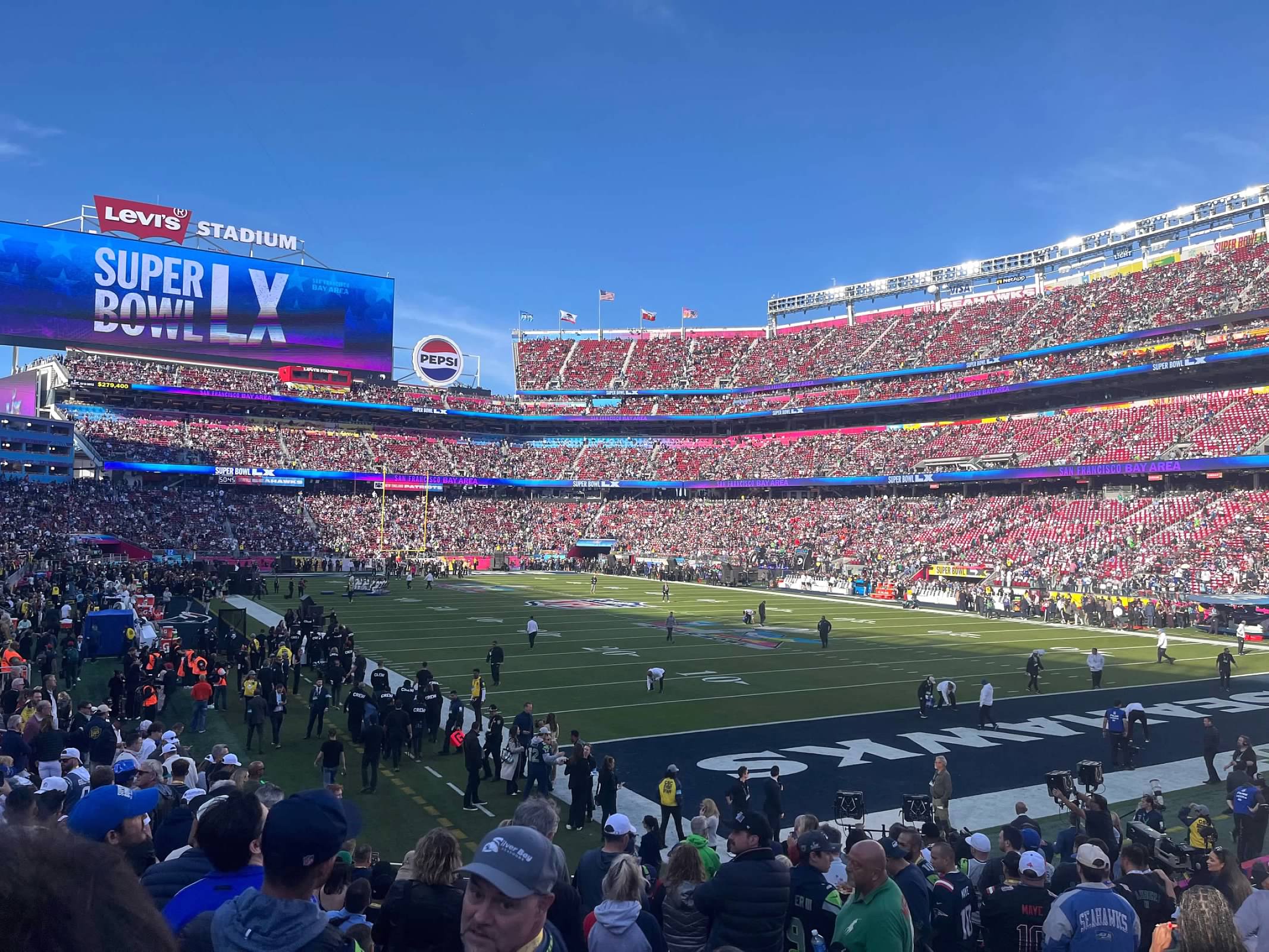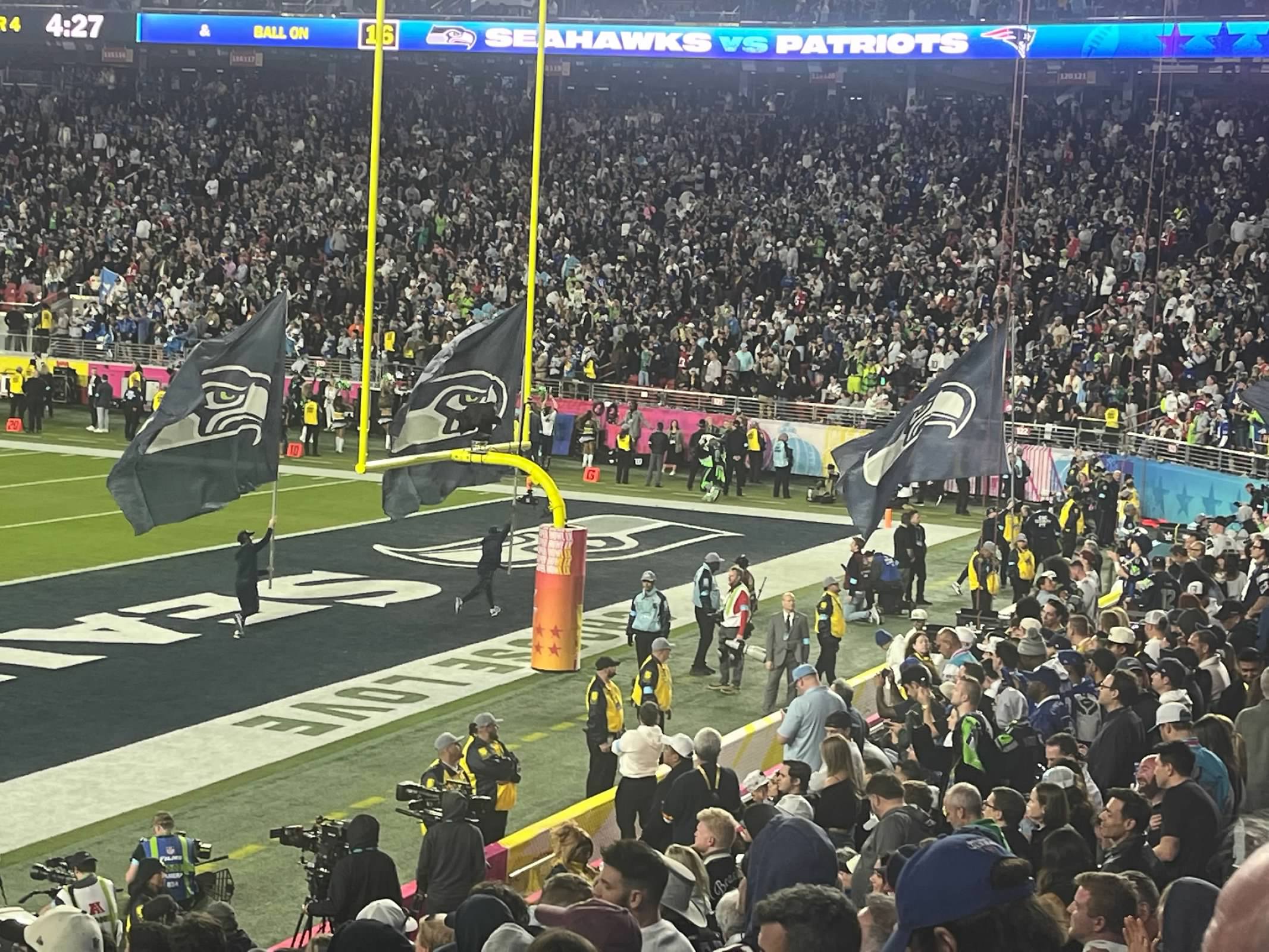 Super Bowl crowd je dosta drukcije. I reko bi da je jedno 1/3 neutralnih ili ljudi koji ne navijaju ni za Hawks ni za Patriots. Dosta ljudi koji su imali neke hoodies ili majice sa Super Bowl, bez obiljiezja timova koji igraju, znas da su tu samo zbog Super Bowl. Reko bi od ostatka jedno 65% to 70% su bili Hawks fans. Osjecalo se ko domaca utakmica. Dobro, Seattle je dosta blize od New England. Ali isto i ko protiv Denver, ja mislim da je dosta navijaca Hawks tu bilo sto idu na utakmice pa su znali kad praviti buku dok su Patriots nekako vise bilo obitelji, tu za Super Bowl. Vrijeme je bilo prekrasno oko 20'C. Ali kasnije kad je sunce zaslo, vjetar je bas duvao.