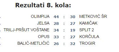 Proslo je i ovo osmo kolo. Nakon jucerasnjih rezultata danas Opuzenci kuci sigurno do bodova. U derbiju kola sukladno vecini najava Trogirani su slavili u Splitu i skinuli RK Balic-Metlicic s vrha tablice. Glatka i uvjerljiva pobjeda koja je vec na poluvremenu bila izrazena dvocifrenom razlika pokazuje da se Trogir ponovno ukljucuje u borbu za prvo mjesto. Do kraja prvenstva je jos dug put i sve je moguce