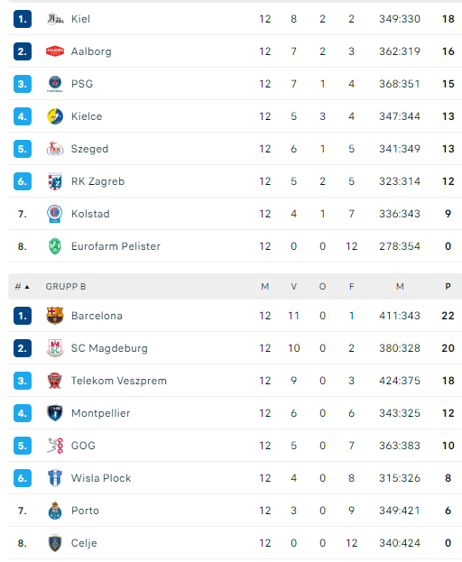 Sve i dalje otvoreno za prvi 2 mesta u oba skupine. Posledno kolo igraju Veszprem vs Magdeburg. Za direkno mesto u top 8. Wisla i Porto za mesto u top 16.
