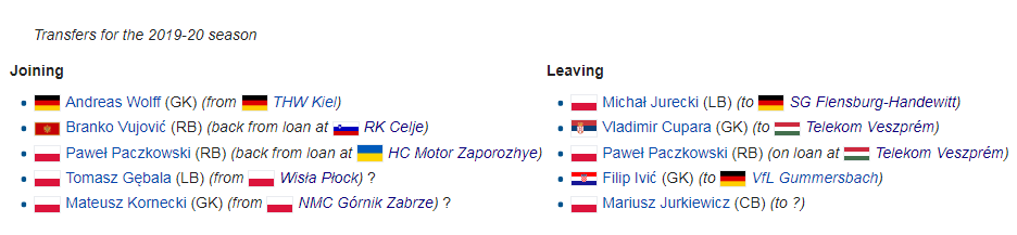 oni koj oficialno dolaze sledece sezona su andreas wolff (zatoode ivic a ne zbog drugo ili novac tesko pored wolff-a da dobio znacena minutaza), dolaze branko vujovic koj ima odlicna sezona za celje, dolaze Gebala iz Wisla, i vraca se Paczkowski iz Motor. Ovo je potvrdeno od klub.