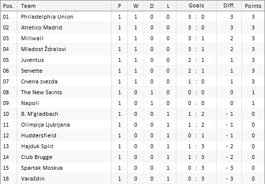 Huddersfield - Atletico M. 2:3 (1:1) 0:1-Griezmann (9), 1:1-Kachunga (28), 2:1-Mounie (73), 2:2-Costa (83), 2:3-Lemar (90+4)