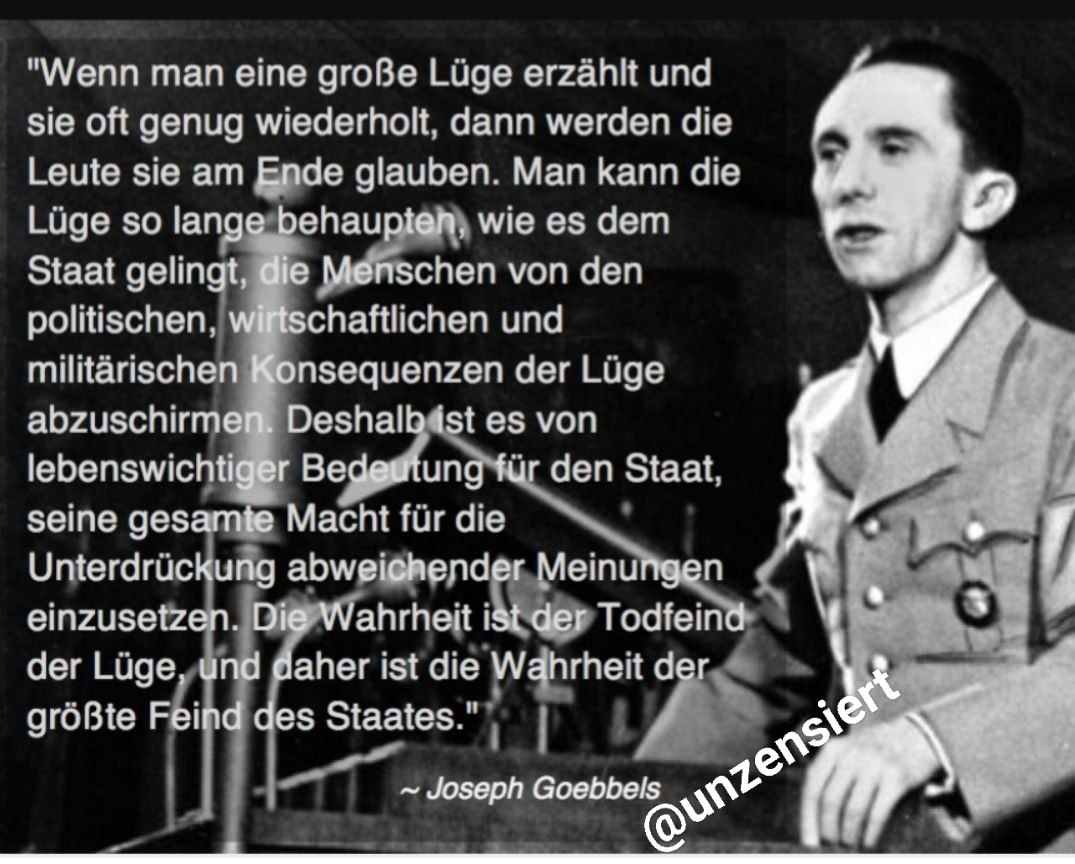 “Ako izgovorite veliku laž i ponovite je dovoljno puta, ljudi će na kraju povjerovati. Laž se može održati sve dok država uspije zaštititi ljude od političkih, ekonomskih i vojnih posljedica laži. Stoga je od vitalne važnosti da država iskoristi svu svoju moć za suzbijanje neslaganja. Istina je smrtni neprijatelj laži, a time je i istina najveći neprijatelj države. "