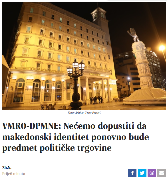 Dok se VMRO-DPMNE bori za Makedoniju kao samostalnu i suverenu državu, SDSM i DUI su se borili kao da zadovolje tuđe interese na štetu građana. VMRO-DPMNE neće dopustiti da makedonski identitet ponovno bude predmet političke trgovine. "Ova će vlada usmjeriti zemlju na put istinskih europskih vrijednosti, čuvajući naš jezik, kulturu i nacionalni identitet", kaže VMRO-DPMNE.