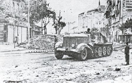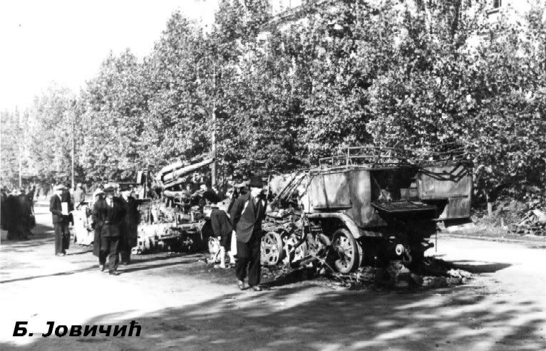 Nemački top u plamenu i ostaci motorizovane kolone grupe "von Stettner" ispred zgrade studentskog doma u Bulevaru Kralja Aleksandra