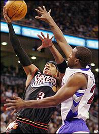 Toronto je ubilježio jedanaesti poraz u nizu. 76ersi predvođeni Allenom Iversonom (42 koša, 5 asista i ukradenih lopti) nisu imali prevelikih problema protiv Raptorsa koji su u potpunim problemima. Iako su jučer igrali u punoj postavi ništa im nije pomoglo. Vince Carter je odlično čuvan te je zabio samo 12 koševa dok je jedina svjetla točka bio Antonio Davis (26 koševa, 9 skokova).