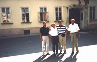 Matuš pred rodnom kućom. Stoje slijeva: Branko Mučnjak (gradonačelnik), Ivica Krušelj, Željko Matuš i Josip Krušelj-Pauk