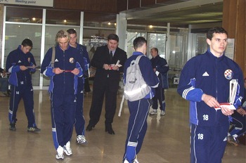 Nasmiješene i bolje volje nego u Poreču, kada su iskazali malo nezadovoljstvo produženjem boravka na "fizičkim" pripremama zbog loših uvjeta u Zagrebu, susreli smo "plave dečke" na zagrebačkom aerodromu. Plava ekspedicija sastavljena od 25 igrača među kojima nema mlade nade zagrebačkih plavih Nike Kranjčara, nema ni ponovo "načetog" nesretnog Krznara koji nikako da završi jedan ciklus priprema i pruži Dinamo igre zbog kojih je i došao. Ali zato se primjetno povećala "vinkovačka veza" i sada u Dinamu za momčad konkuriraju Čutura, Sesar i novo pridošli Leutar.