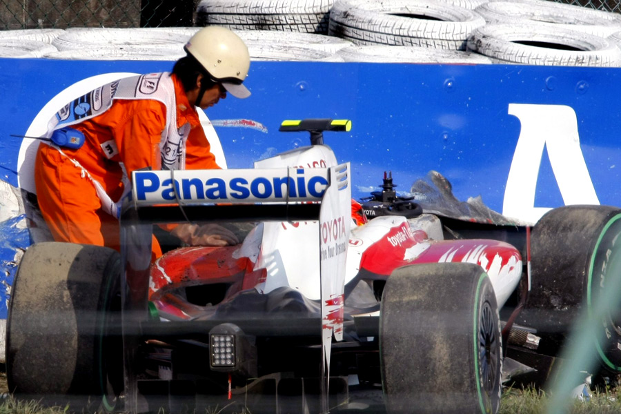 Iako je inicijalna dijagnoza bila samo porezotina noge detaljniji pregled otkrio je i napuknuće jednog kralježnjaka zbog čega je Timo Glock prisiljen odustati od nastupa na Grand Prixu u Brazilu...