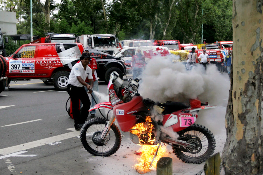 Očekivano, najviše natjecatelja prijavljeno je u konkurenciji motocikala gdje će čak 151 vozač pokušati prevaliti dugačkih devet tisuća kilometara po prašnjavim stazama diljem Argentine i Čilea. Uz prošlogodišnjeg pobjednika, Marca Come, svakako vrijedi spomenuti i prvu žrtvu ovogodišnjeg izdanja reli Dakar. Naime, nesretni Javier Pizzolito nije uspio obaviti niti ceremonijalni start i nakon eksplozije svog motora prisiljen je odustati i prije pravog početka.