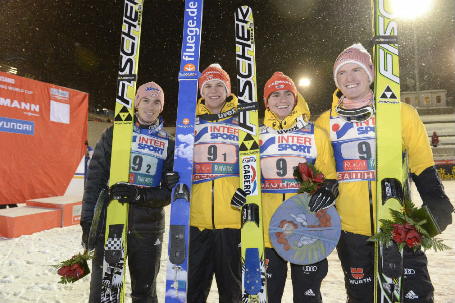 Njemačka reprezentacija predvođena mladim Andreasom Wellingerom osvojila je momčadsko natjecanje u finskom Kuusamu. Upravo 17-godišnji Wellinger imao je najduže skokove (137 i 143 metara), a uspješno mu se pridružio i ostatak momčadi - Michael Neumayer, Richard Freitag te Severin Freund.