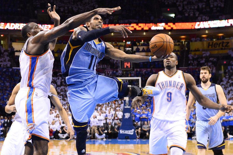 13 sekundi prije kraja regularnog dijela vodio je Memphis 98:93 i činilo se da će odnijeti pobjedu, međutim onda Kevin Durant ubacuje tricu iz iznimno teške situacije u padu uz prekršaj Marca Gasola. Nakon dodatnog slobodnog bacanja na drugoj strani Mike Conley ubacuje samo jedno bacanje i Oklahoma kreće u zadnji napad. Tricu je promašio Russell Westbrook, ali je skok u napadu uhvatio Kendrick Perkins i sa sirenom utakmicu odveo u produžetak.