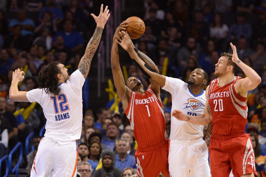 Durant je izjednačio osobni rekord s 56 uzastopnih utakmica s 20+ poena, ubacio je 23 poena (7/14 za dva, 1/5 za tri) uz sedam skokova dok je Russell Westbrook dodao 21 poen (7/11 za dva, 0/7 za tri), 15 asistencija i 13 skokova. Kod Houstona James Harden ubacio je 24 poena (5/9 za dva, 2/8 za tri) uz rekordnih 16 asistencija i sedam skokova dok je Dwight Howard dodao 16 poena (7/8 za dva) i 13 skokova.