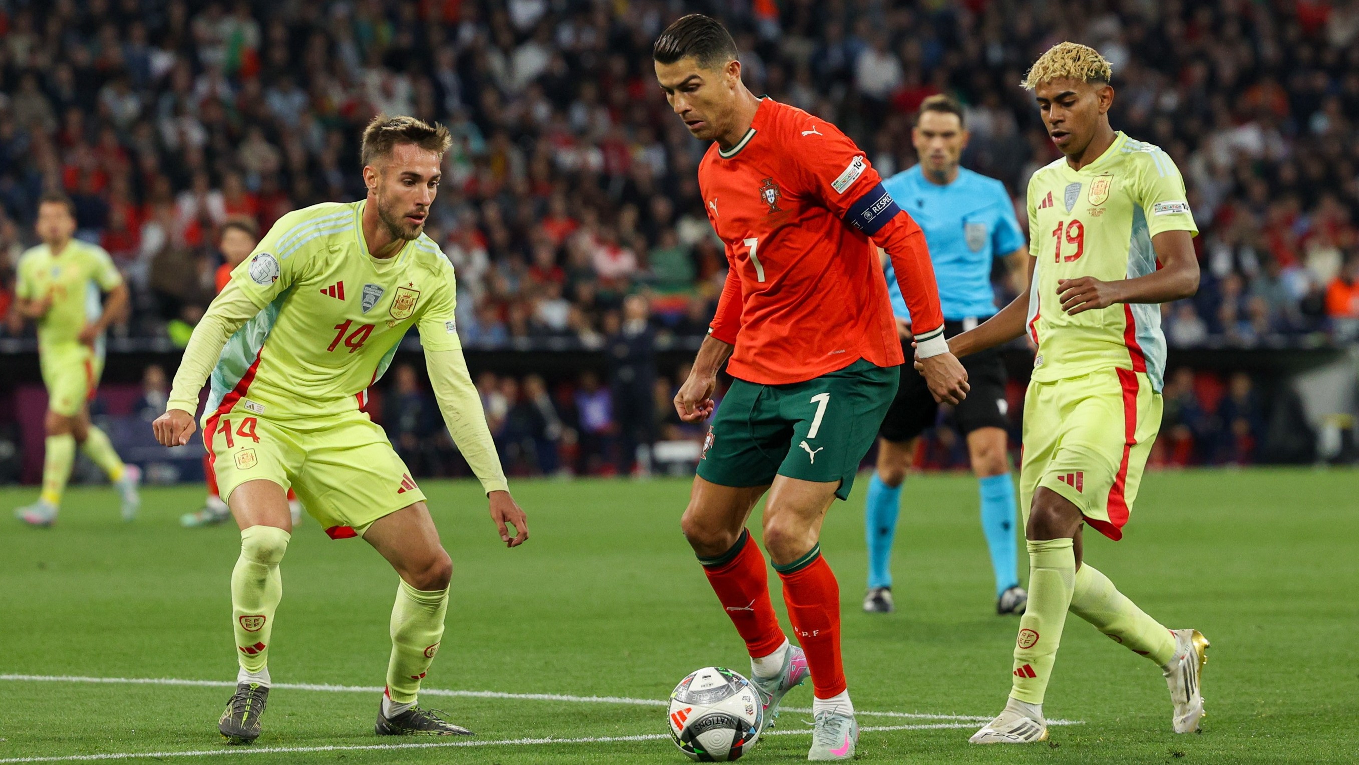 Prvi pogodak stigao je u 21. minuti. Odbijala se lopta pred golom Portugala, pokušao ju je odbiti Joao Neves, ali je samo proigrao Martina Zubimendija koji pogađa praznu mrežu.