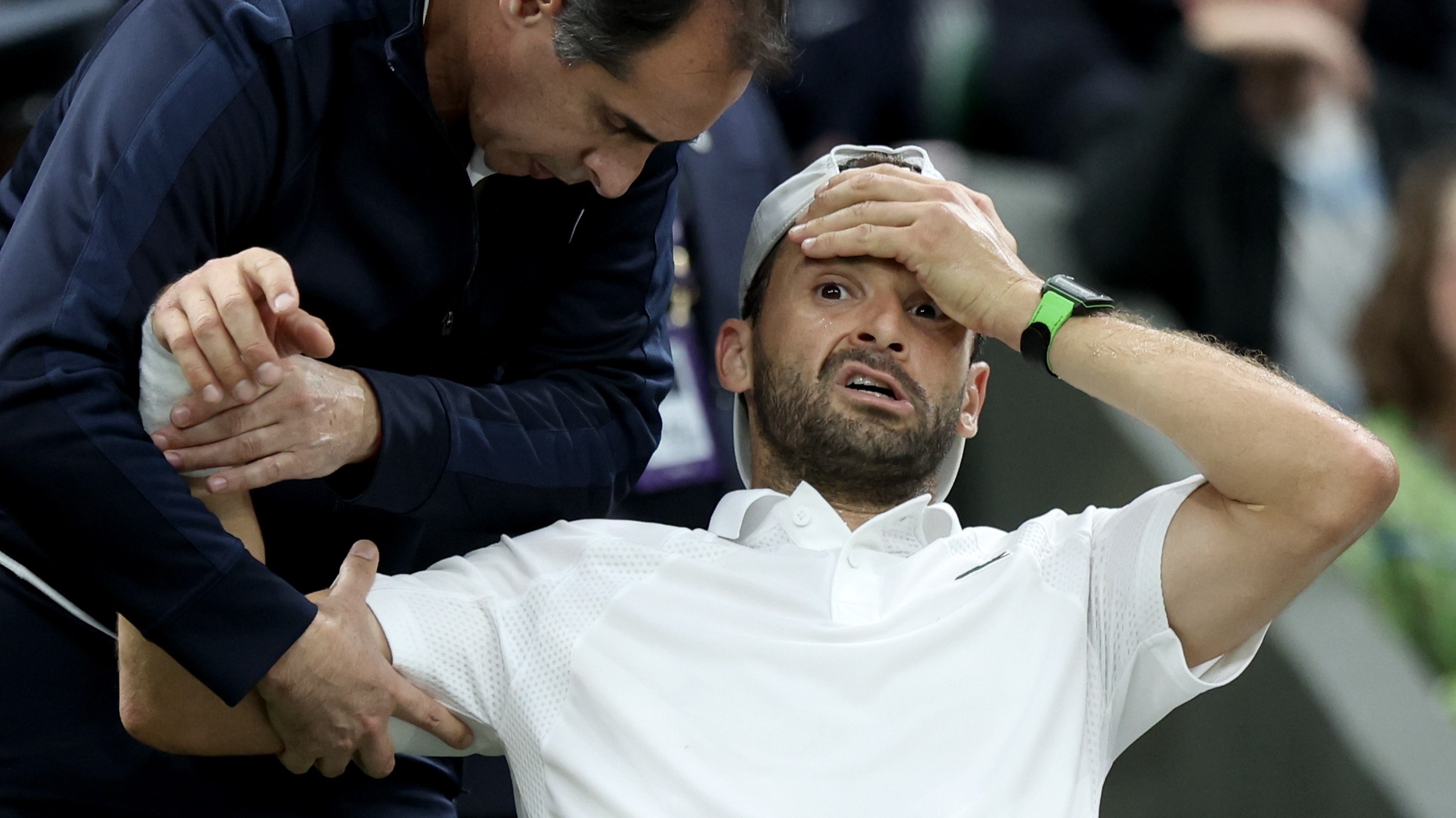 Teški trenuci jučer na središnjem terenu u Wimbledonu. U posljednjem susretu kod tenisača igrali su Jannik Sinner i Grigor Dimitrov, a Dimitrov je bio prisiljen na predaju zbog ozljede.