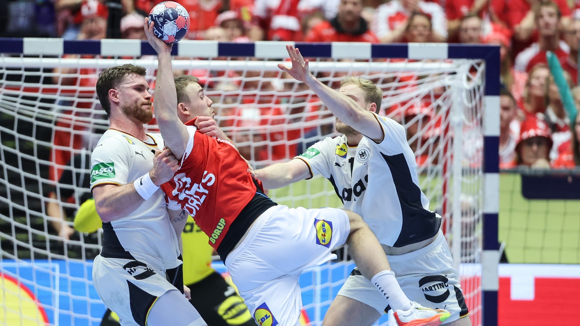 U prepunoj dvorani danskih navijača u Herningu, Njemačka se odlično držala do posljednjih pet minuta zahvaljujući raspoloženom Andyju Wolffu, ali nije niti on mogao vući svih 60 minuta, na kraju su Danci serijom 5:0 završili posao i slavili s 34:27.