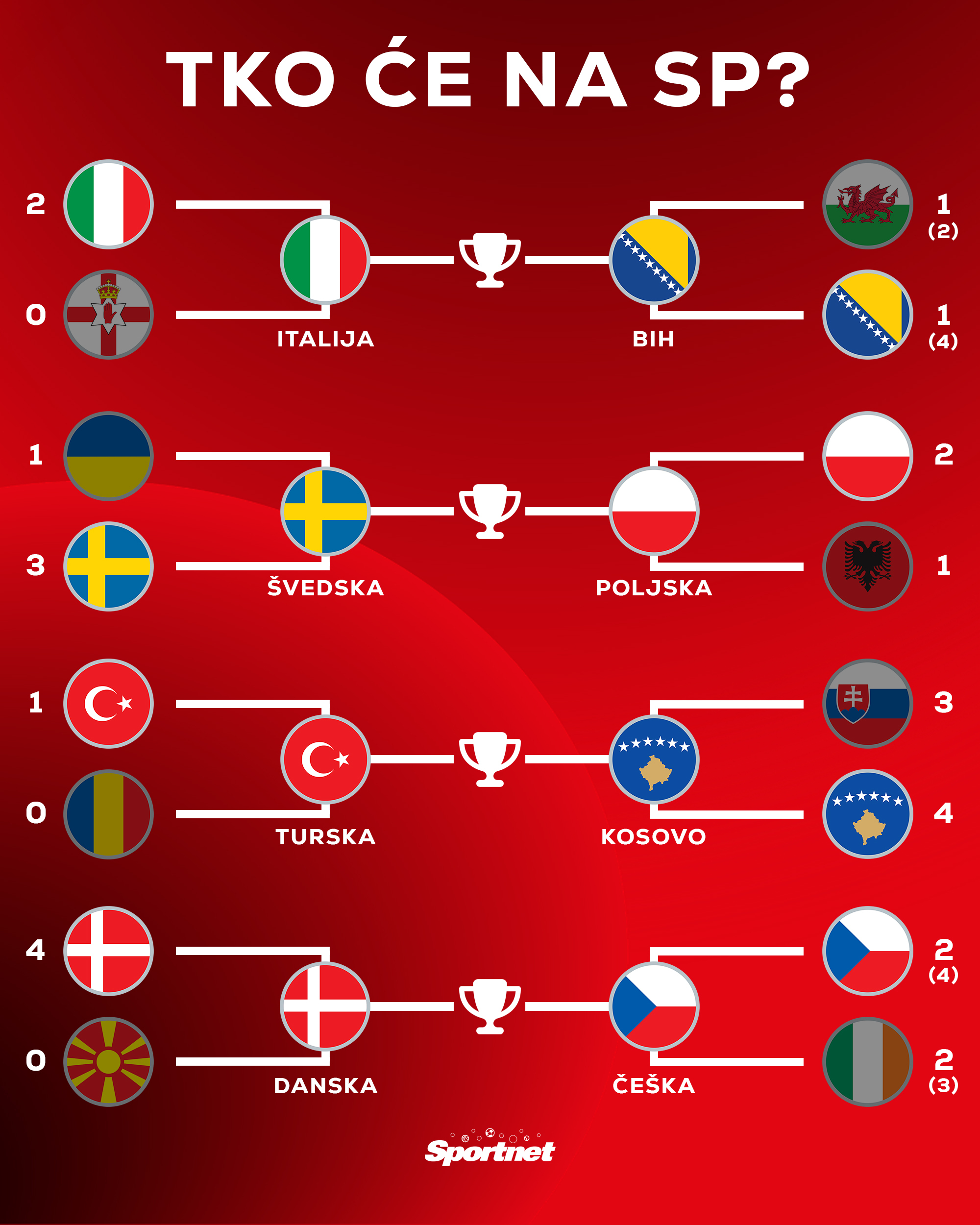 Utorak večer donosi nam finalne utakmice doigravanja za plasman na Svjetsko prvenstvo. Mundijal u SAD-u, Kanadi i Meksiku dobit će četiri nova sudionika, a među momčadima koje se bore za svoje mjesto su i dvije države iz našeg susjedstva.