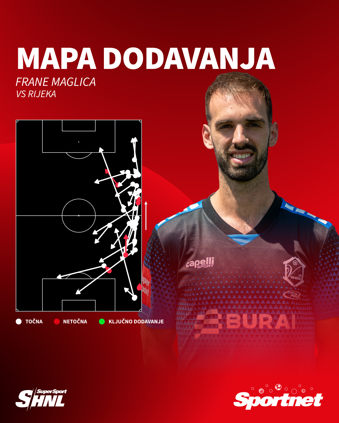 Ukupno 25 točnih dodavanja imao je Maglica od 30 pokušaja, od čega 11/13 na protivničkoj polovici te 14/17 na vlastitoj. Ostvario je 58 dodira s loptom, koju je u nogama vodio ukupno 90 metara, a uz jedno presijecanje dodao je tri otklonjene opasnosti i jedan klizeći start.