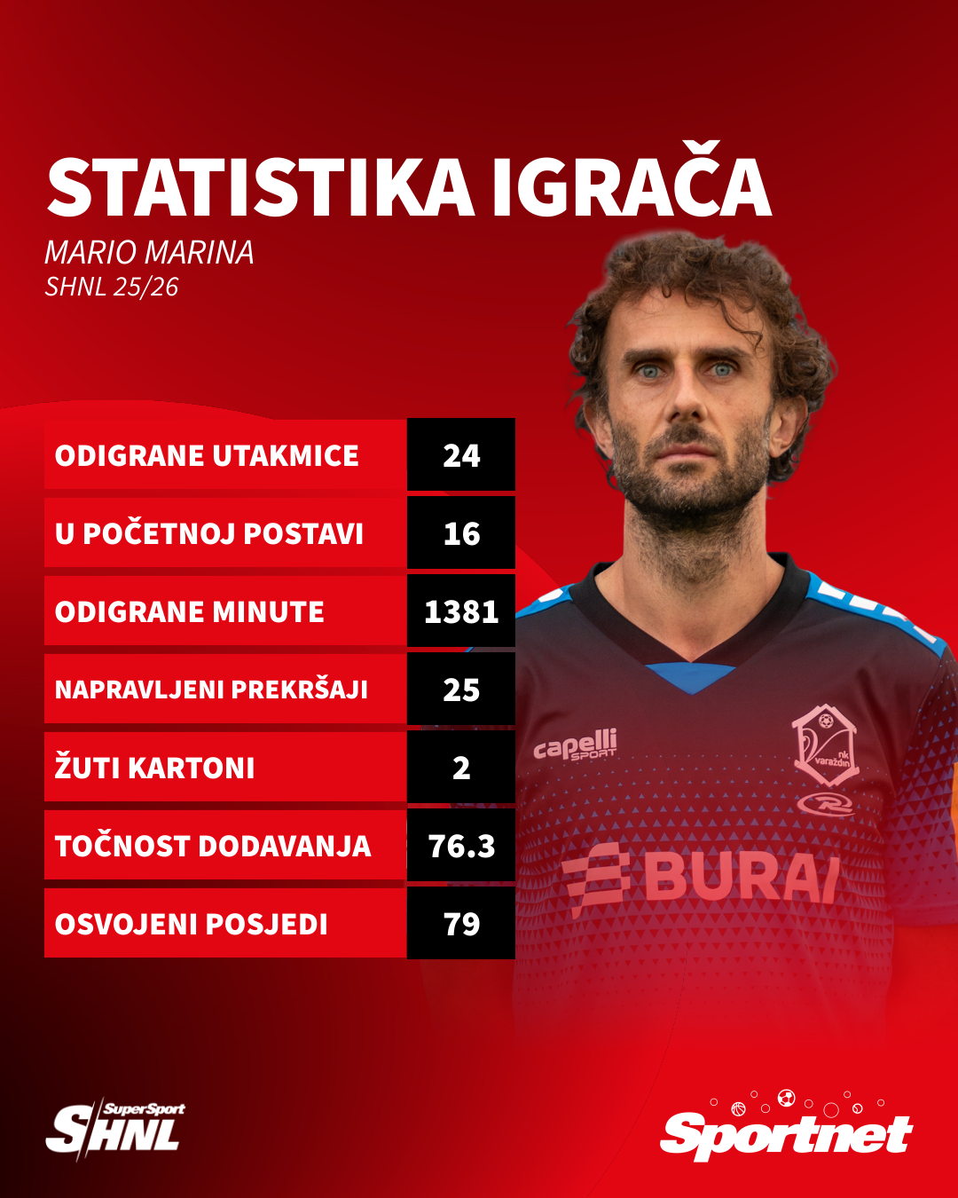 Primjer igrača protiv kojega nitko ne voli igrati, a koji je omiljeni suigrač. Marija Marinu uvijek nekako povezujemo uz prekršaje i žute kartone, a vjerovali ili ne - ima ih tek dva u 1.381 minuti provedenoj u SHNL-u ove sezone.